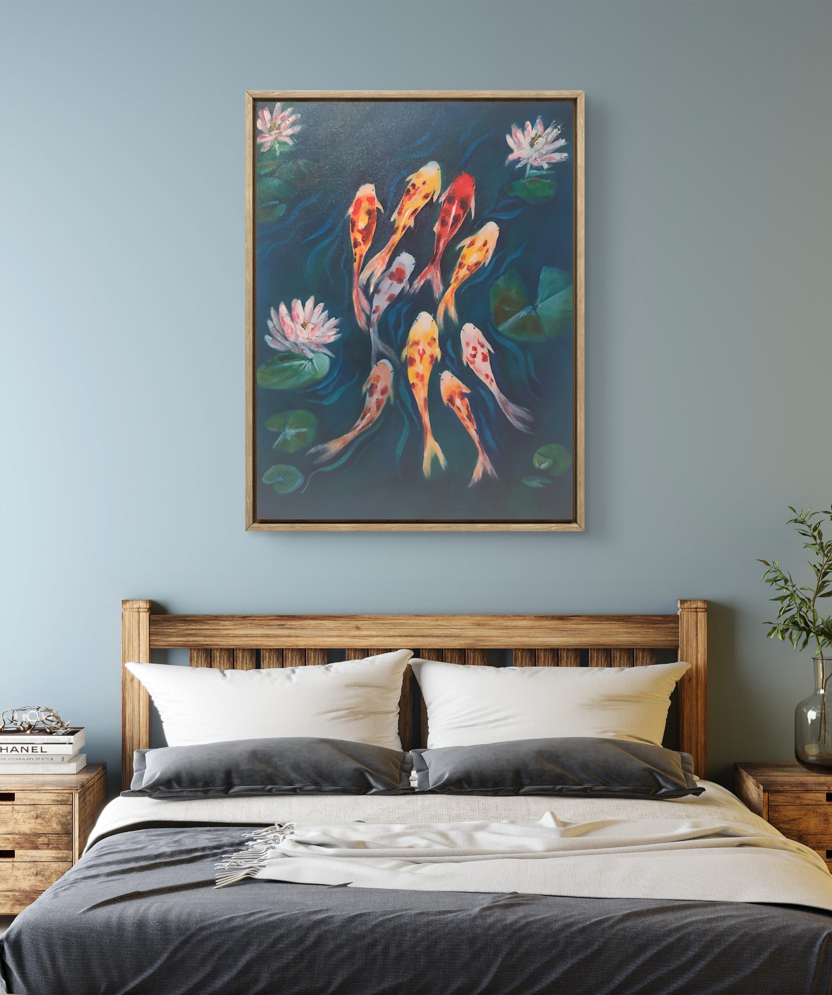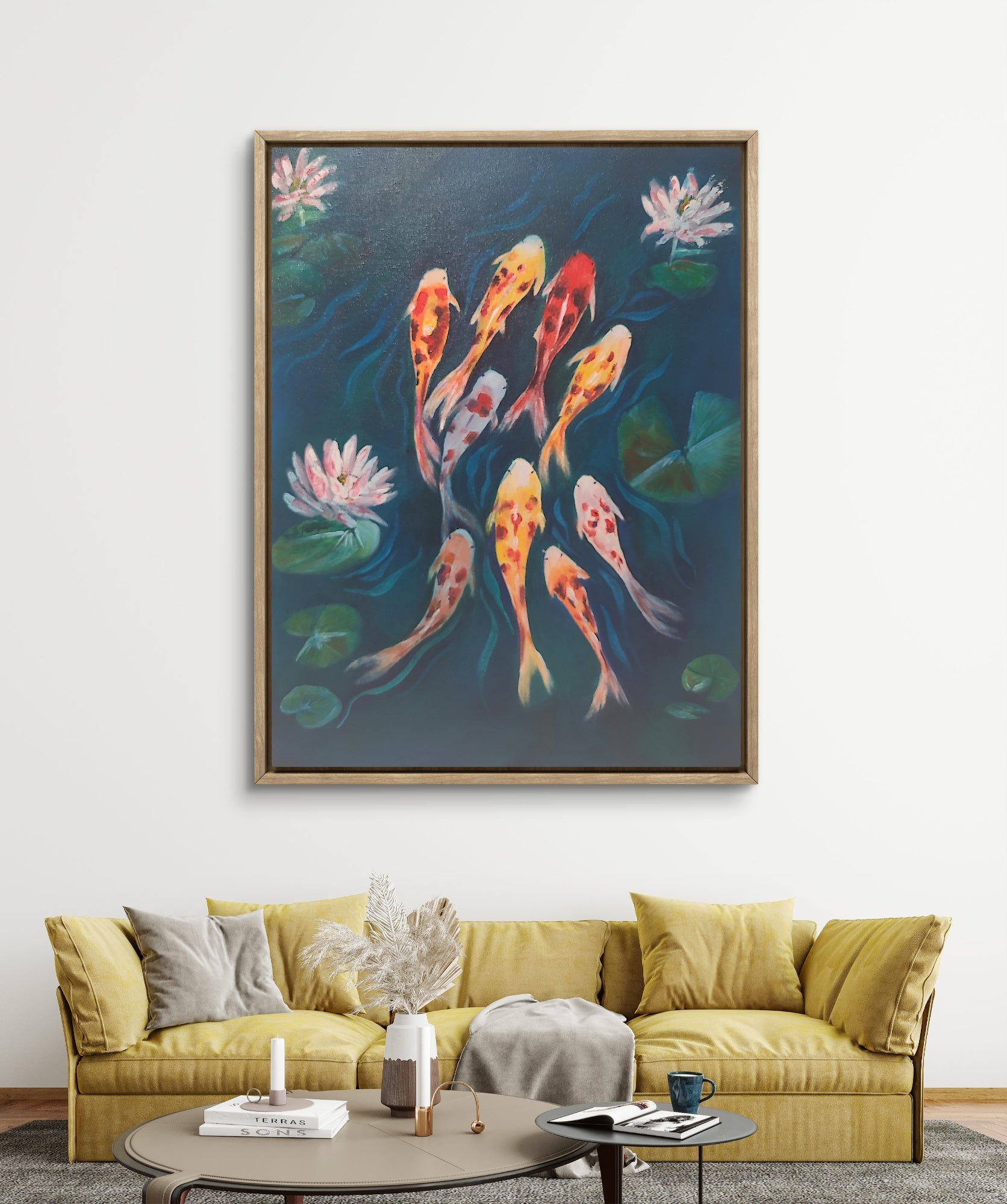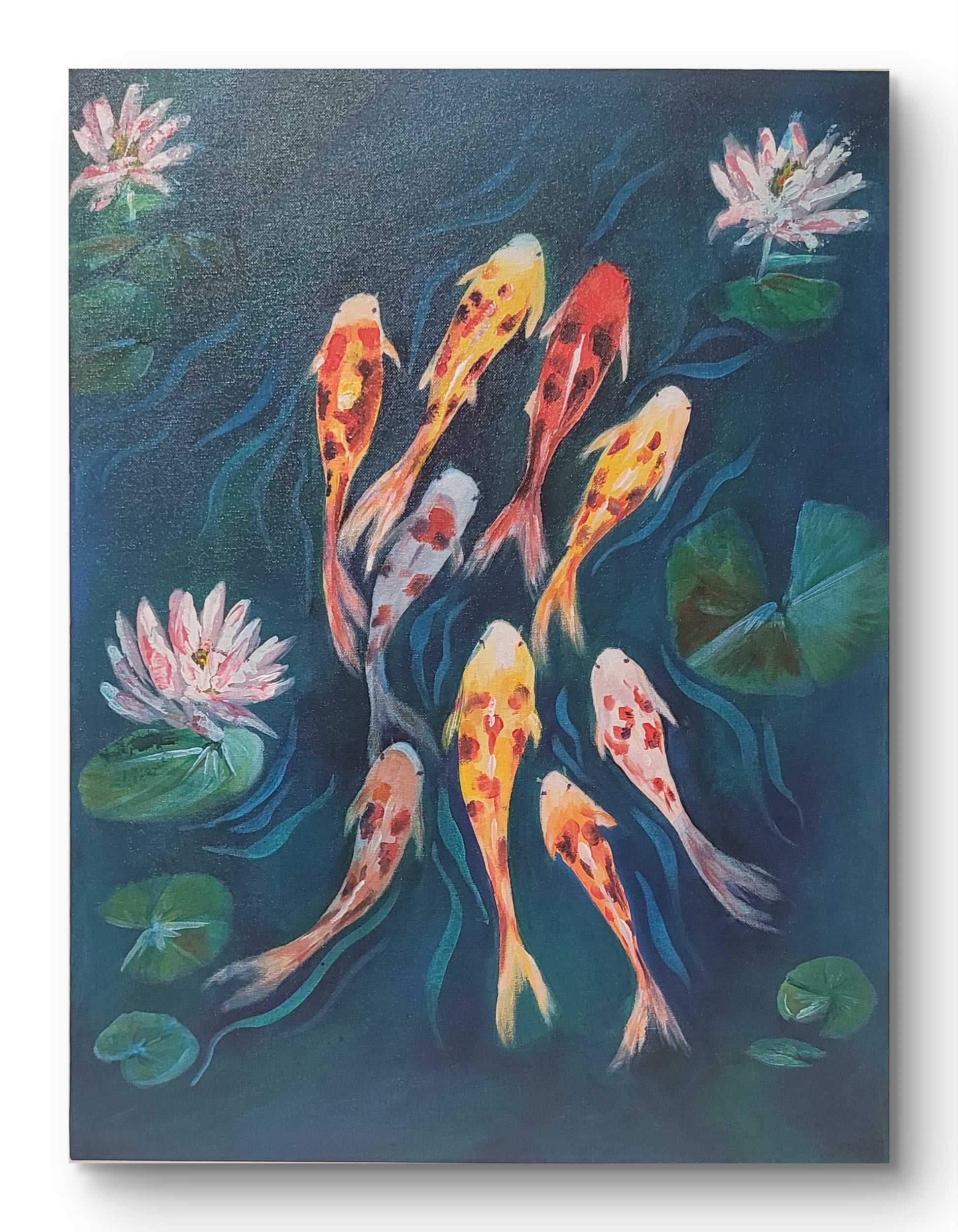 Each stroke brings the water to life, creating gentle waves that echo harmony. Symbolizing luck, perseverance, and abundance in many cultures, the koi become more than just a visual — they become energy for your space.