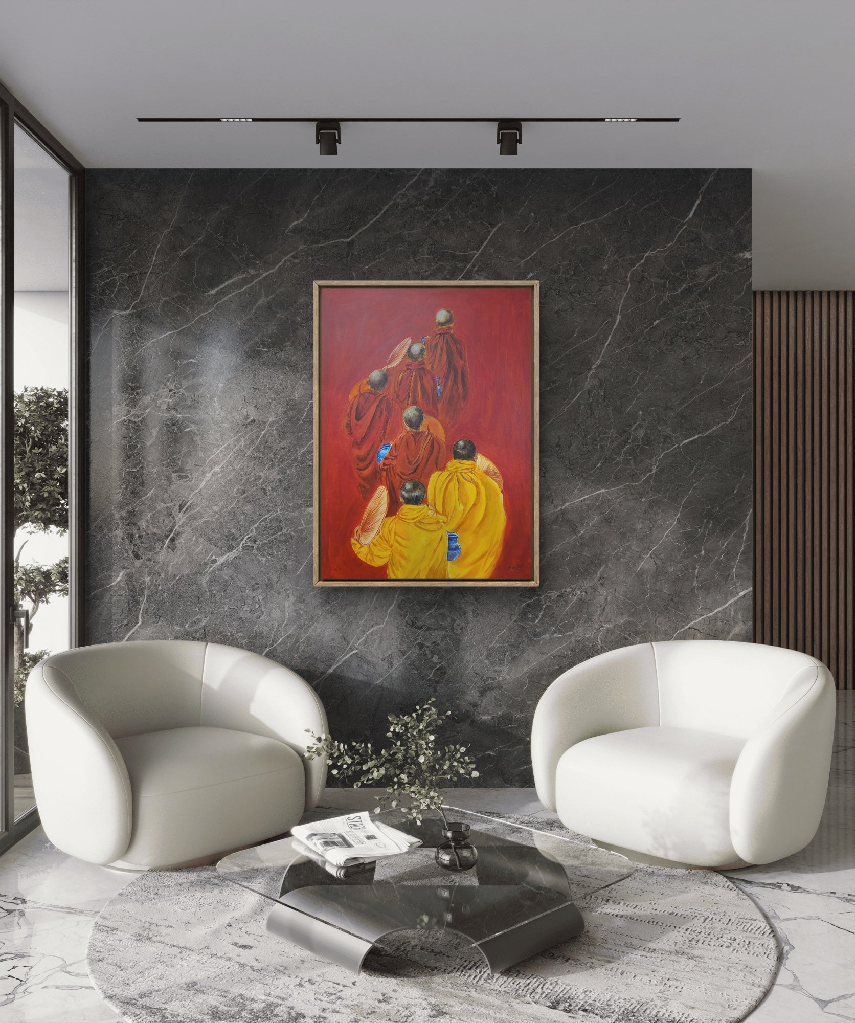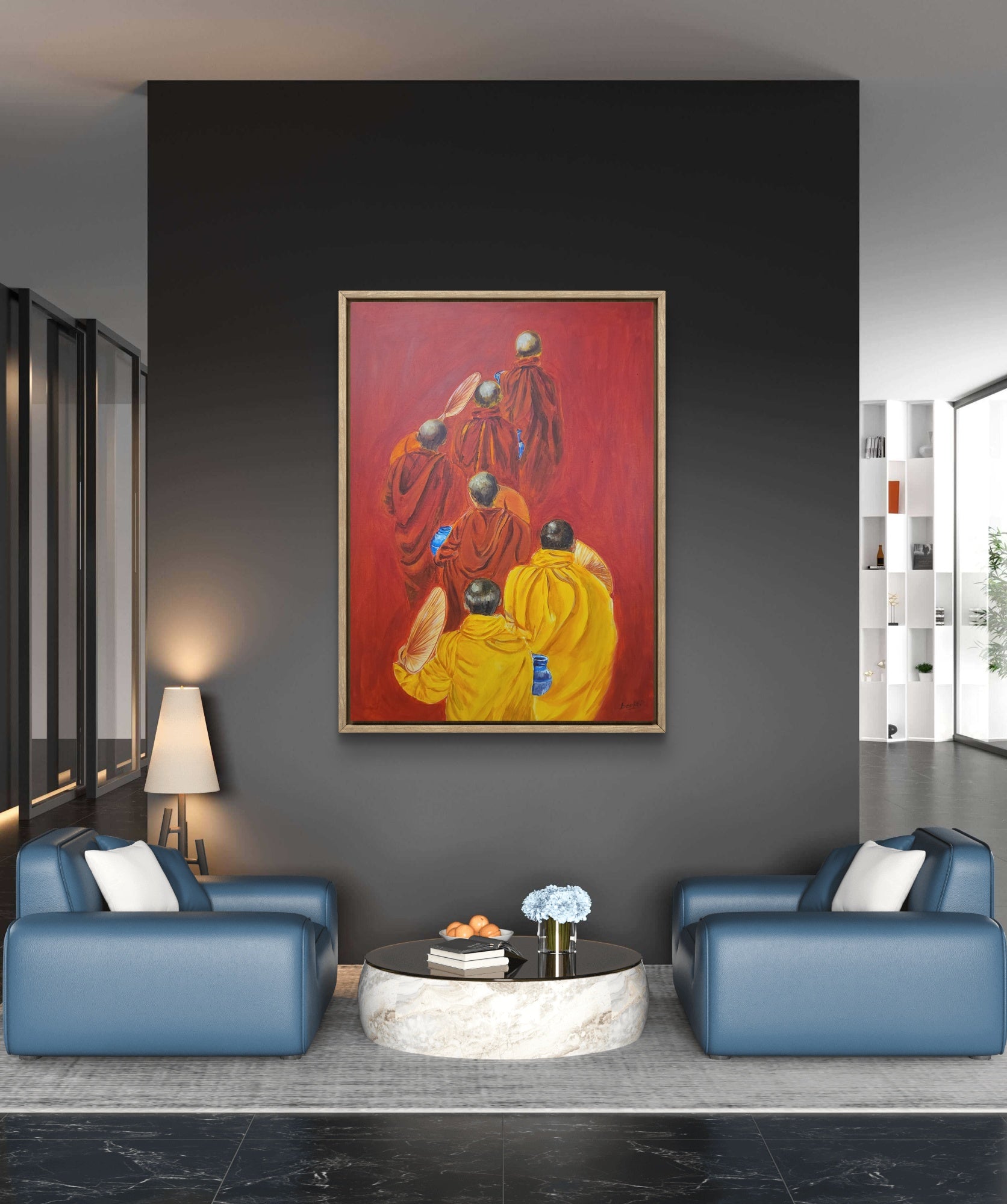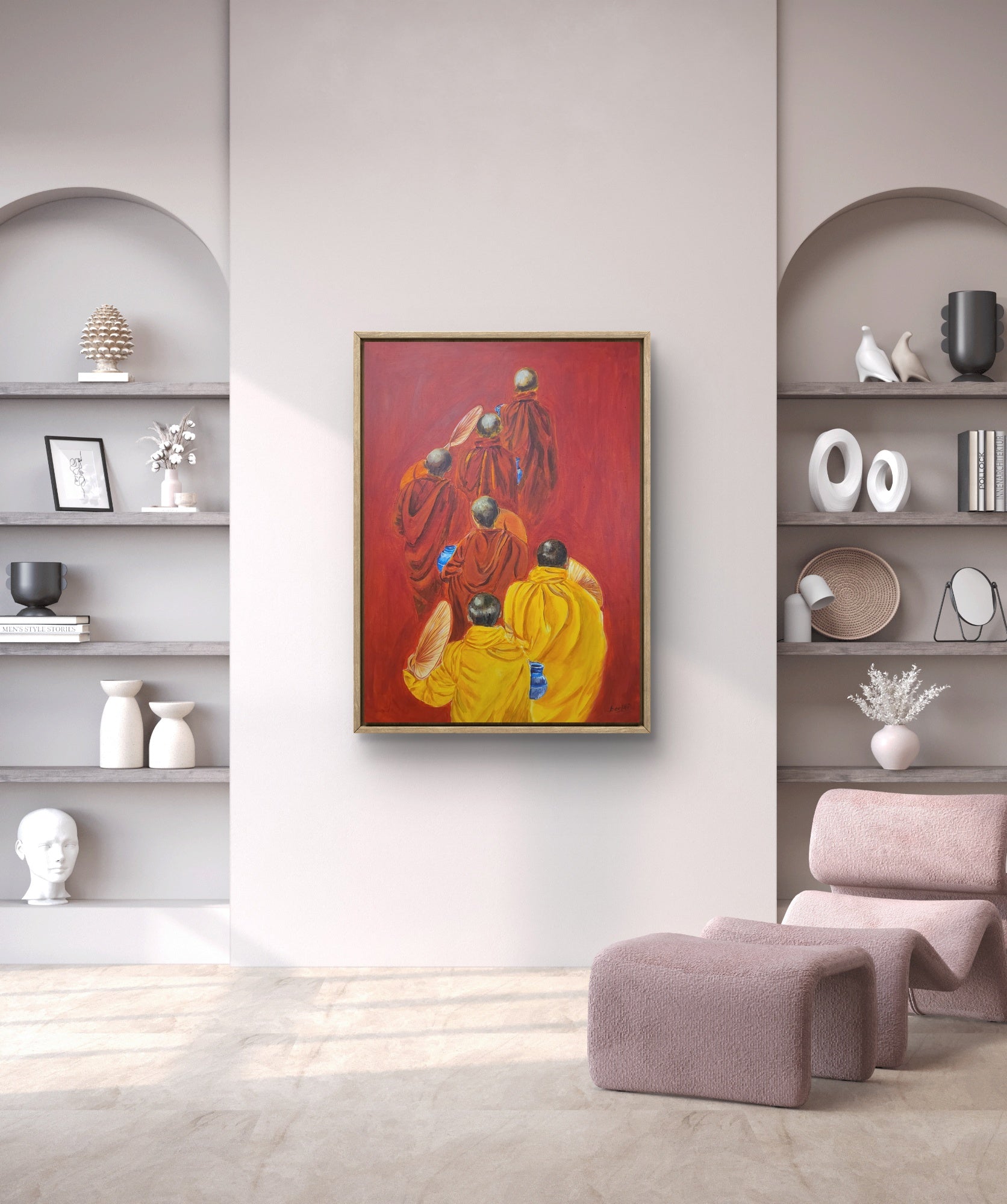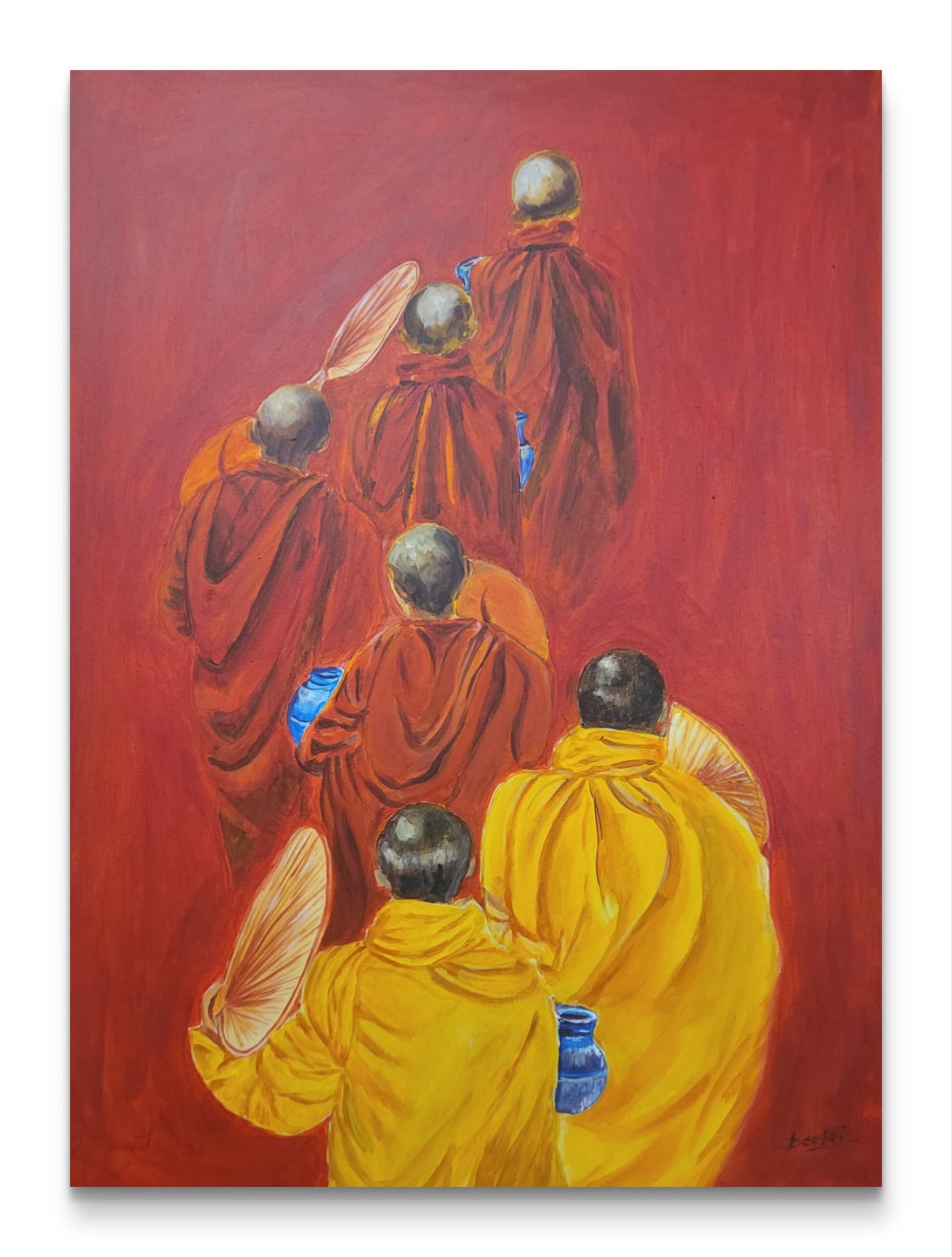 Let tranquility walk into your home with "Path of Serenity", a stunning hand-painted acrylic artwork that captures five monks in flowing robes, walking in quiet reflection. The bold red backdrop symbolizes energy and mindfulness, while the golden and saffron robes evoke warmth, wisdom, and tradition. Every brushstroke radiates the calm strength of a spiritual journey.