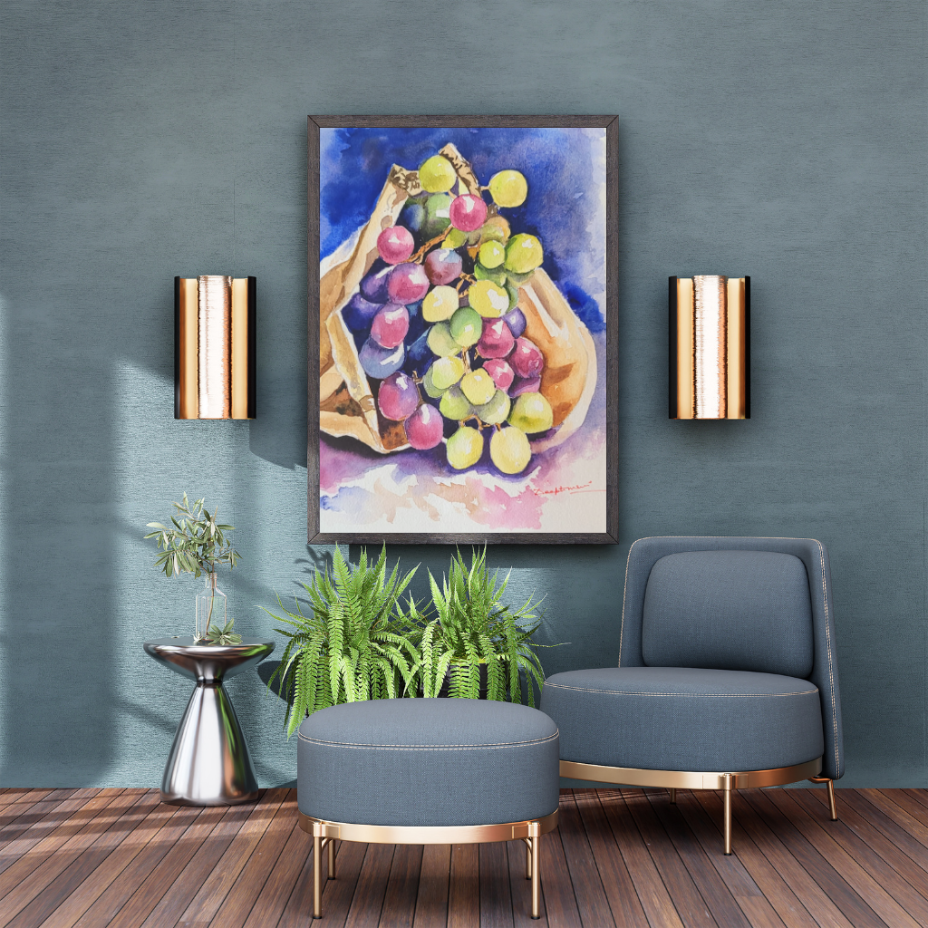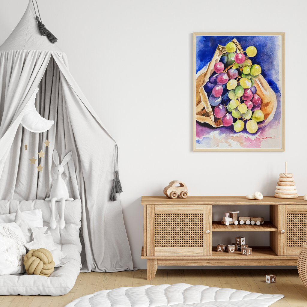 Add a splash of vibrant charm to your space with this hand-painted watercolor artwork featuring a lively bunch of grapes in a variety of colors. From rich purples to sun-kissed greens, this piece celebrates the natural beauty of grapes with expressive brushwork and delicate layering. A visual treat that brings warmth, abundance, and vitality into any setting.